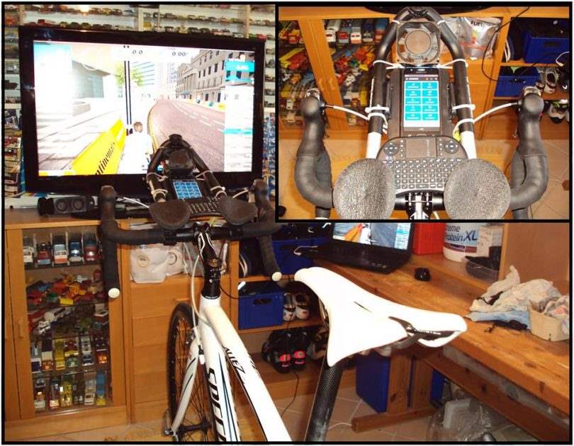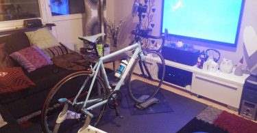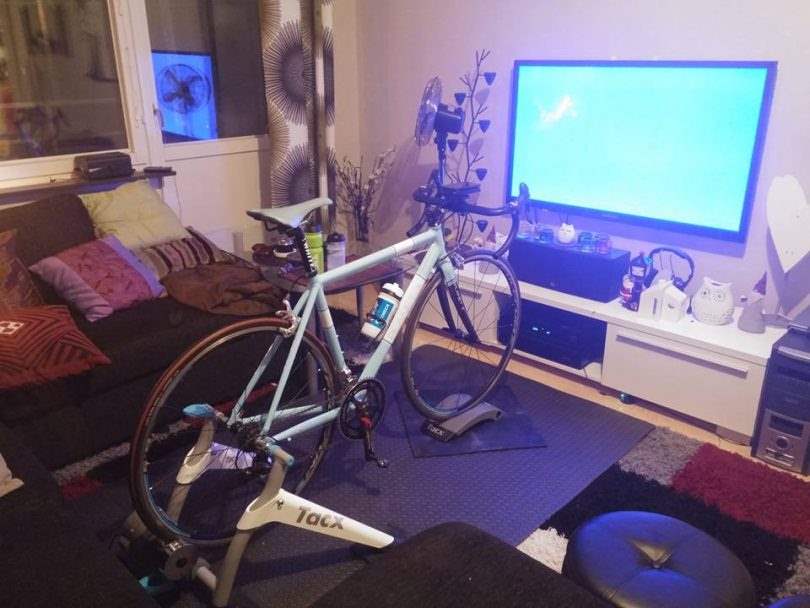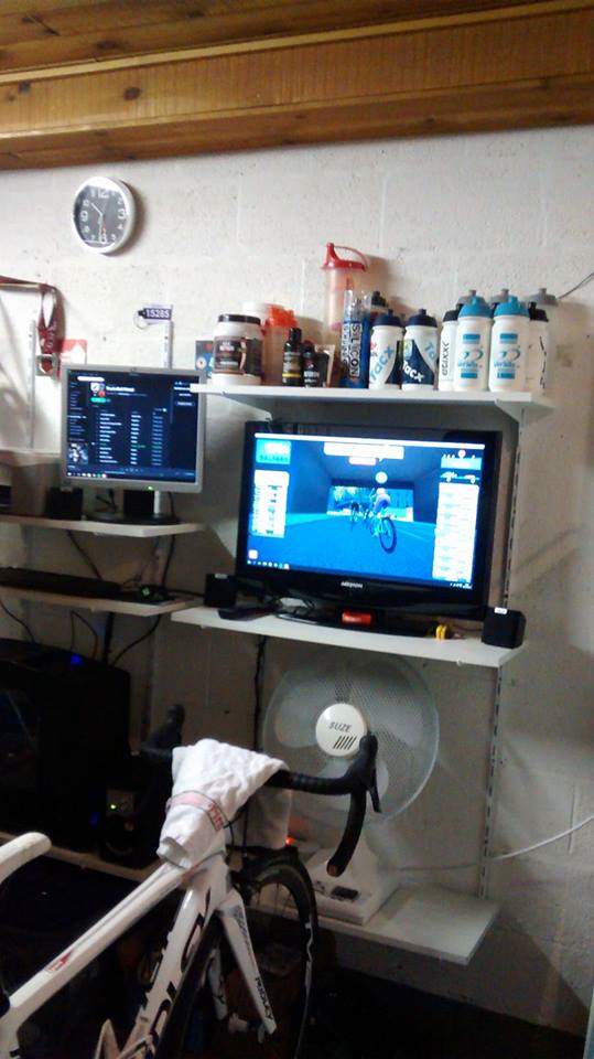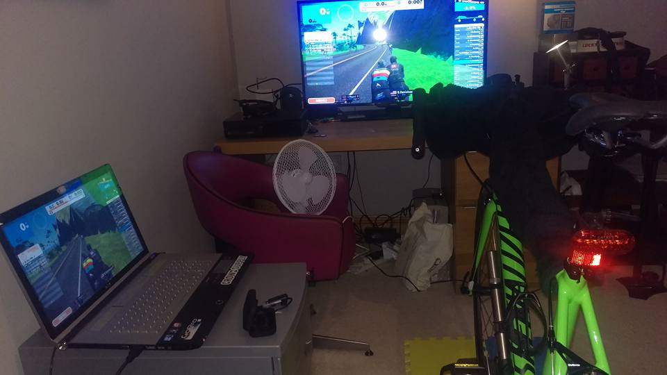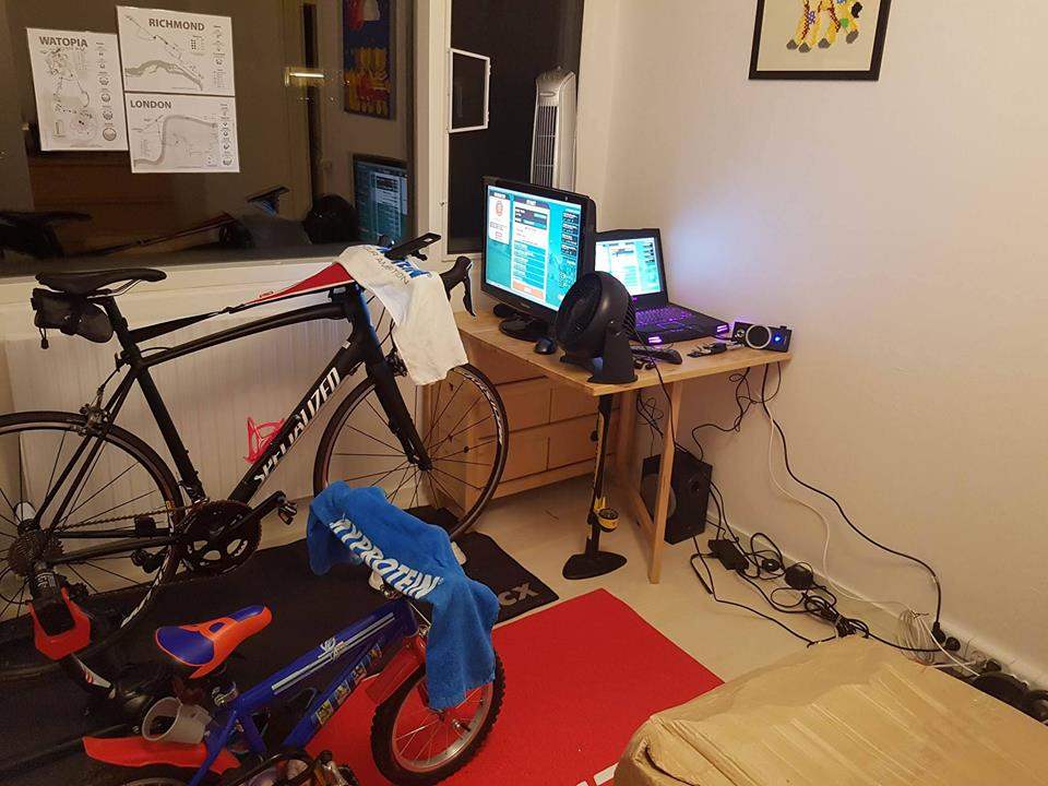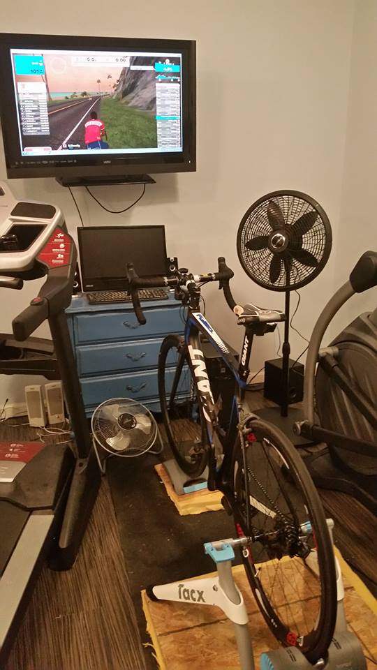 Equipment wise, my bike is a trust Cervelo P2, 2012 edition. I chucked the $150 trainer and treated myself to a Tacx Neo. I also have a Quarq Powermeter crank for racing measurements. There are multiple connection possibilities in my set up. I have a 45-inch flat screen Vizio LCD mounted to a rolling TV stand. The stand also has a table attached to put peripherals.