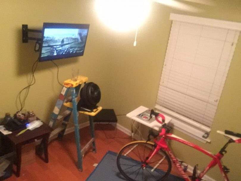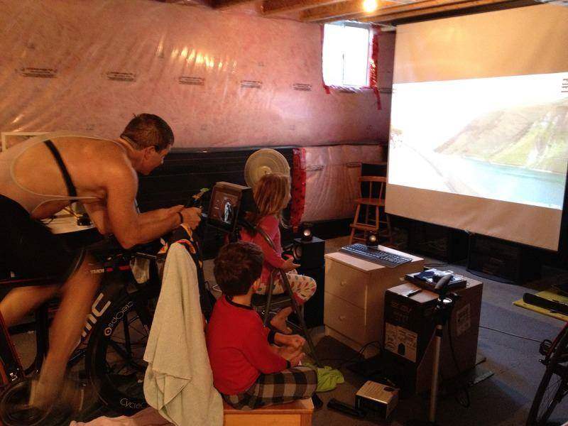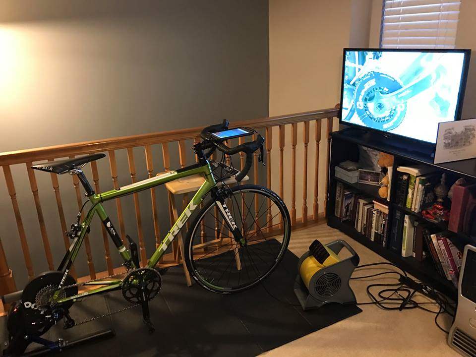 As you can see from the pic, my wife and kids sometimes ride along side with me on a used mag trainer. In that case, I turn on Direct TV on the flat screen and use a laptop/iPad on the stand for either Zwift or Trainerroad.