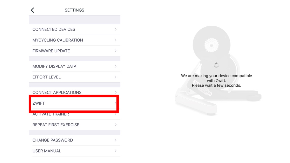 - In settings, click on Zwift and follow the simple instructions to make the trainer compatible with Zwift.