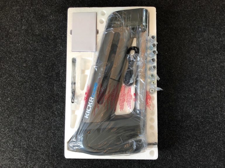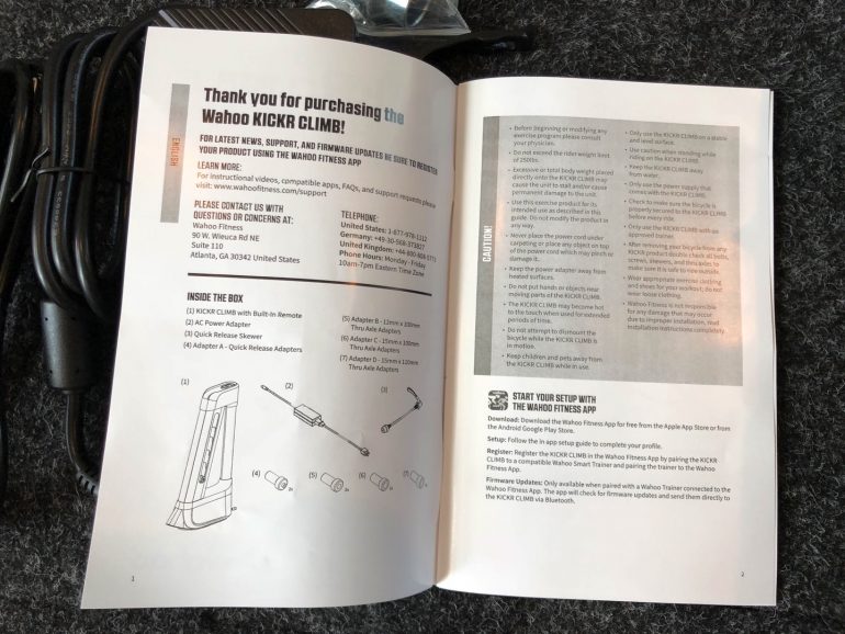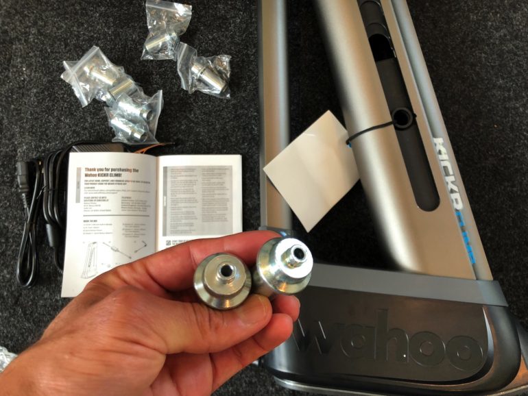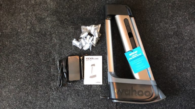 The box has the KICKR CLIMB, hub adapters, manual, a quick release skewer, and a power cable.