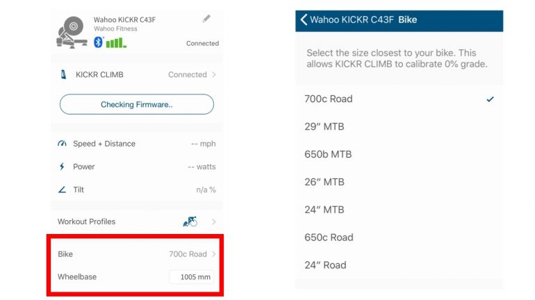 - Go down to the Bike selection menu and select the size of your bike. This allows the KICKR CLIMB to calibrate to 0% grade.
