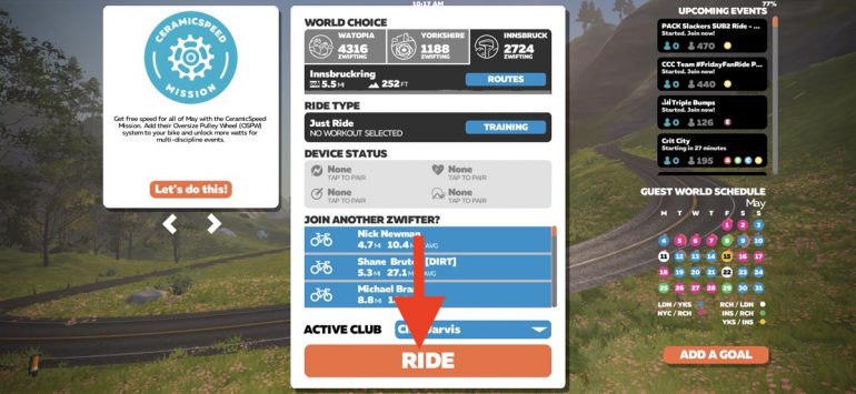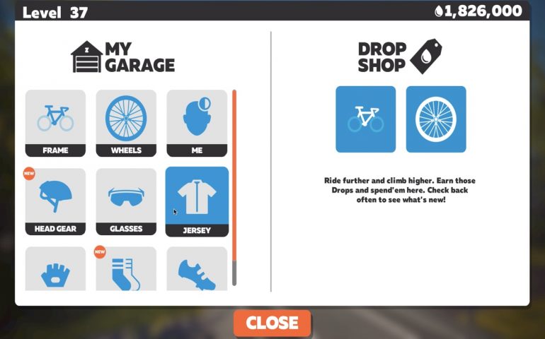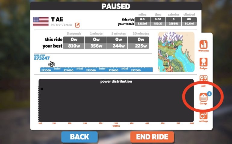 To access the new Drop Shop garage, start a Zwift session and go through the pairing menu and start a ride. Unfortunately, there isn’t a way to get to the Menu without starting a new ride.