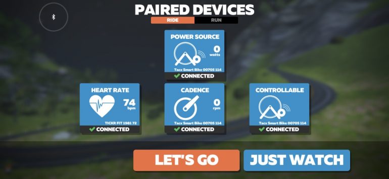 The Paired Devices screen is the first screen you should see when you start Zwift on your device. Pair your devices and click on “Let’s Go”