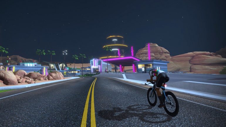 The main route has just a few mild gradient changes, making it ideal for an easy ride, time trial, or all-out effort. Tracking at 10km out and 10km back, a roundabout at the road’s end lets you see the desert from all sides or exit the desert near the base of Watopia’s Epic KOM climb.