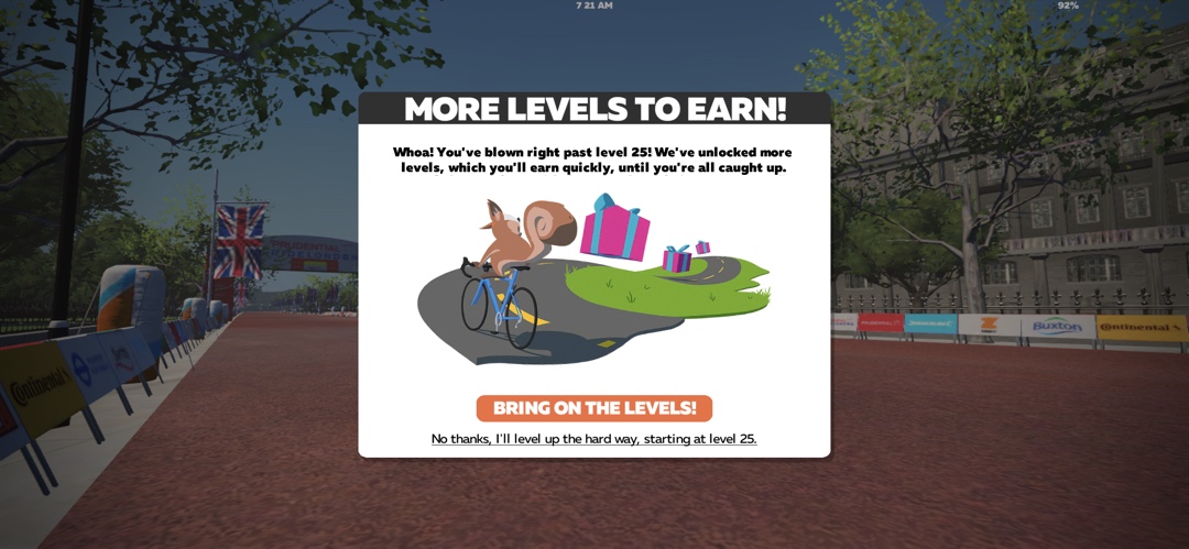 Level 25 is no longer the ceiling in Zwift. With the new update, Zwift released overnight, that cap is now up 50 levels. If you have been at level 25 for a while, next time you log in to Zwift, you will be prompted to unlock more levels. Zwift will reward you with a new level based on the miles or kilometers you’ve already logged. However, you won’t be given a new level instantaneously, instead, you will be on an accelerated path of 10x the XP points until you reach your level.