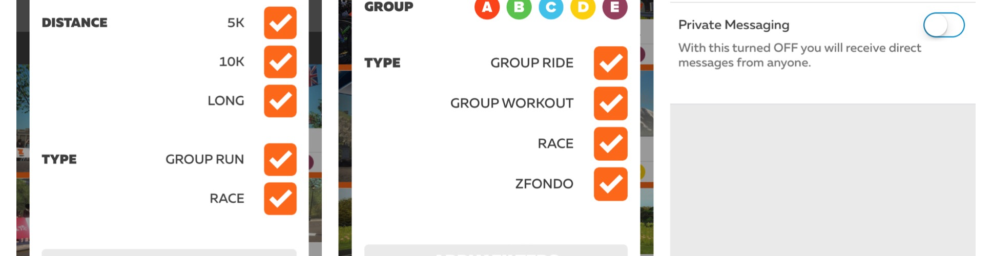 Cycling also got enhanced filtering options. You can filter on the level of group ride (A through E), type of rides such as group ride, group workout, race, or ZFondo.
